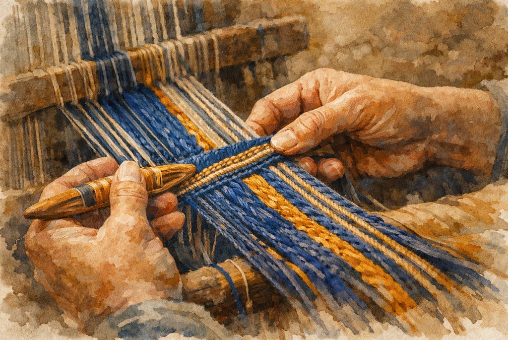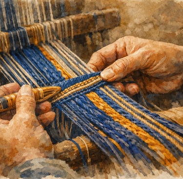 Se trata de una cinta tejida artesanalmente con hilos de azul profundo, dorado solar y ocres terrosos. Cada color repr